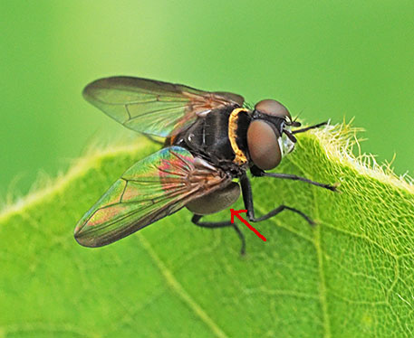 最近のネット検索では,検索エンジンが自動で誤字等を類推した結果を表示してしまうので,類似した和名がある場合はダブルクォーテーション("")で括って完全一致検索をしてみて下さい. なお,両種は腿節と脛節の色が異なり,ショウジョウクロバエは黄色,クマモマトラフバエは黒色です.