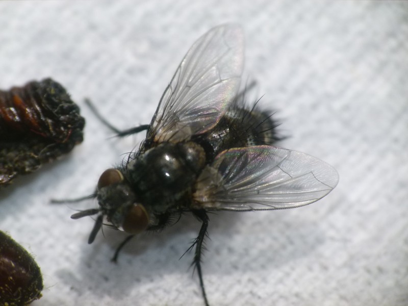 皆様こんばんは。久しぶりにまたお世話になります。冬の間に飼育していたタケカレハ幼虫(カレハガ科)に寄生していたハエについてお尋ねします。 どうも様子が変だと思っていたら蛆に内部寄生されていたようで、寄主を中から食い破って殺し、容器の底には囲蛹が3個転がっていました。 囲蛹の一個から羽化した成虫がこちらです。 とりあえず当てずっぽうで「ヤドリバエ科の一種」としておきましたが、もし更に分類を絞り込めるようでしたら教えてください。ハエの死骸を保存してありますので(あまり状態が良くないかもしれませんが)、同定のためにどの部位のどのアングルの写真が必要か言ってくだされば出来る限り対応致します。 よろしくお願いします。 追加の写真もあるので、よろしければ拙ブログもご覧ください。