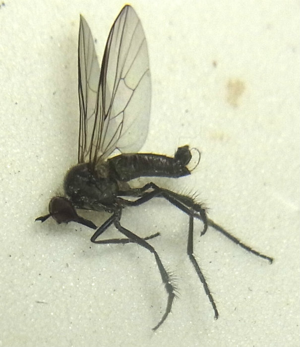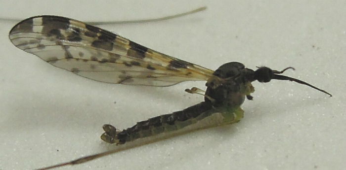 ユスリカであることは間違いありません。写真では頭部の眼斑も明瞭には判りません。が、エリユスリカ亜科Orthocladiinaeの様です。尾針台の特徴も明瞭ではありません。この部分のキチン化の状態も同定には重要な形質となります。Mentum(下唇板)が判れば、はっきりすると思います。時期的なこと、体長などを参照にすれはエリユスリカ属Orthocladiusかフユユスリカ属Hydrobaenusのどちらかでしょう。可能性としてはキソガワフユユスリカH. kondoi Sætherが最も高いでしょう。