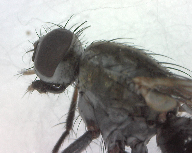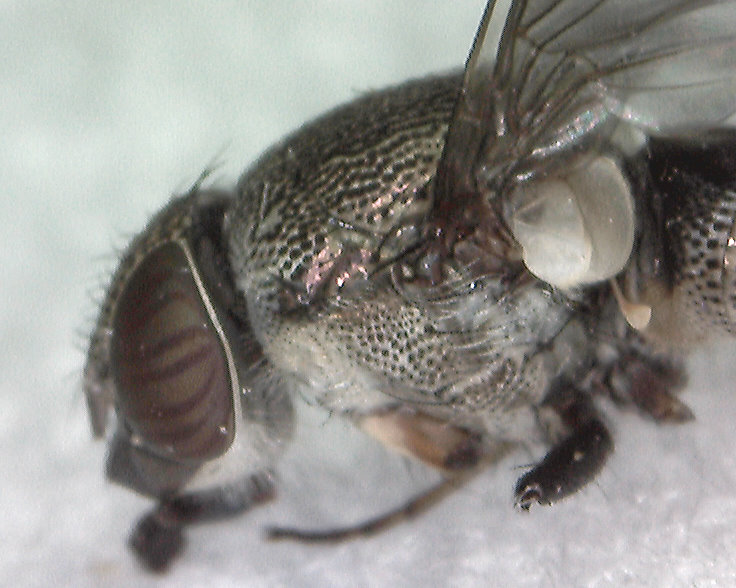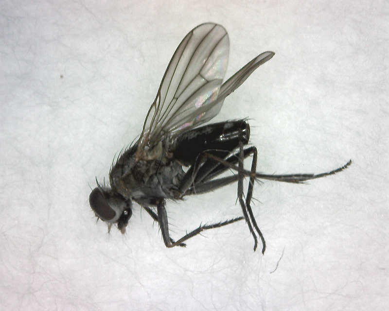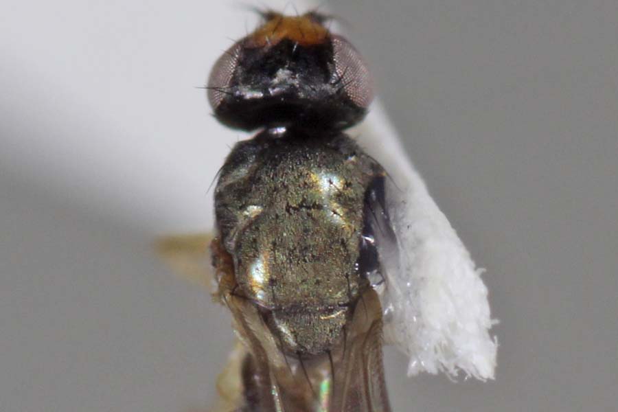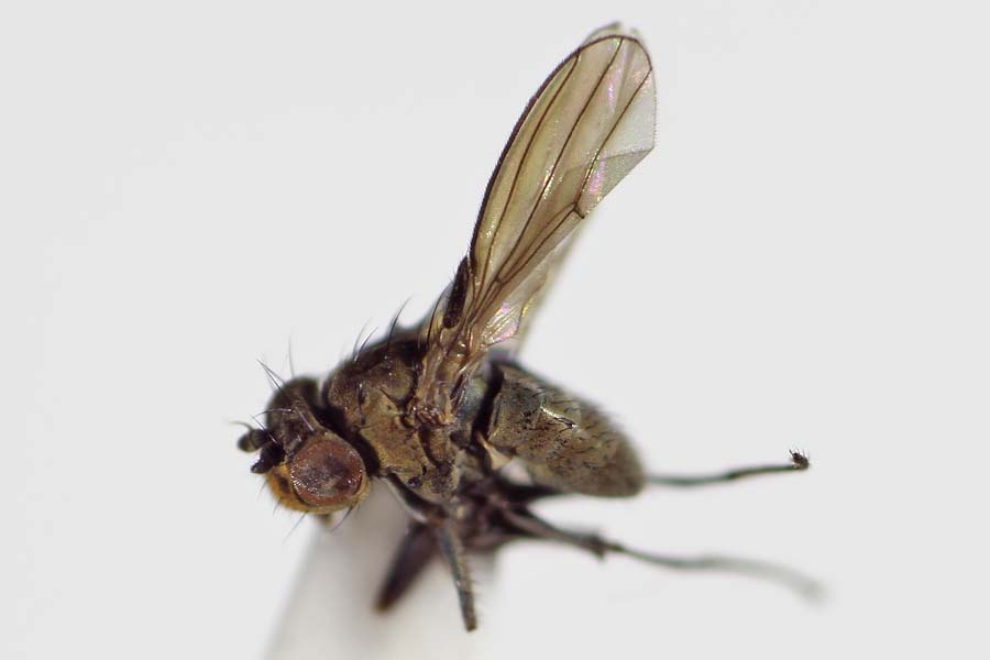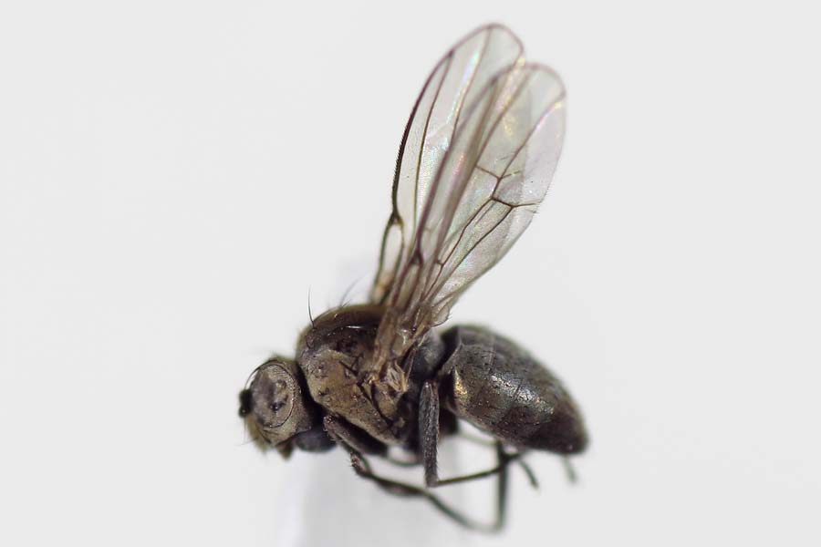 第2基室+中室の後縁脈中央にゆがみがあり、たぶんキモグリバエ科でしょう。Apotropinaあたりかな。