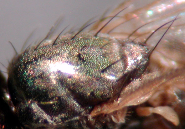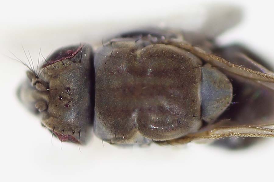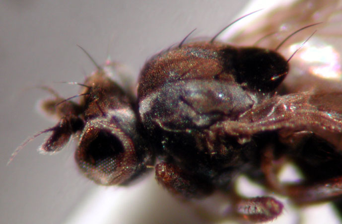 Apotropinaはキモグリバエ科としてはやや異形の属ですが、前述のような翅脈上のゆがみ、大型三角形のocellar triangle、相互に相接して交叉する後単眼剛毛を目安にするとミギワバエ科でないことがわかります。なお、この属は後前胸背板剛毛(肩剛毛)が2本ある点、中胸背面の刺毛が長いこと, 額眼縁剛毛がミギワバエ科の多くのように外側を向いて複眼の上にかかる、などの点で他のほとんどのキモグリバエの属から識別できます。これらの形質は私の粗い画像でもわかるでしょう。特に最後の額眼縁剛毛の向きがミギワバエ科と取り違えられる点です。