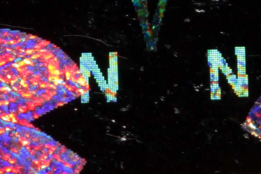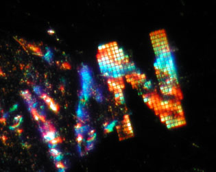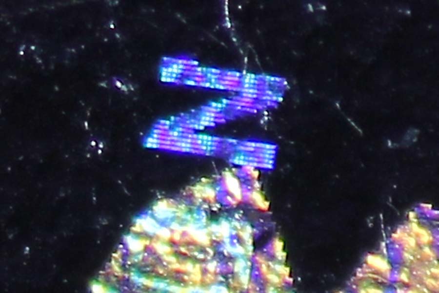 ホログラムの1つ1つの隅がはっきり見えているので,色にじみやブレが無いきれいな写真だと思います. 画素数が少ないのが難点ですが,COOLPIX990や995は顕微鏡撮影に最適なカメラだと思います. 同シリーズが,COOLPIX4500を最後に消えてしまったのが残念です.(後年,COOLPIX S4というスイバル式が復活しましたが,フィルターネジが無いので特殊なアダプターが無いと顕微鏡に取り付けることが出来ません.) レンズ部が回転出来るのが仇になったのか,故障しやすいカメラなので,大事に使ってください.
