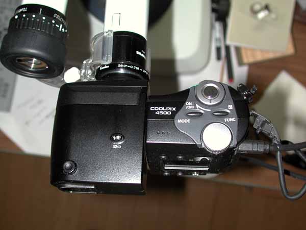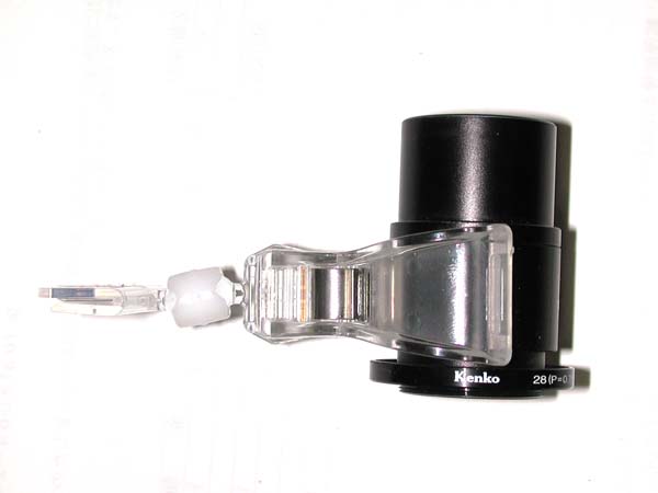 COOLPIX990の画素数が少ない点を不満として、その後CanonのPowershotS5ISにクローズアップレンズをつけたり、銀塩カメラのOlympusOM4シリーズのマクロ撮影レンズ、装置一式を持っていたので、同社のE-420のボディーを買ってフォーサーズでレンズを取り付けてみたり、いろいろ試みましたが、使い方が下手なのか、後者は液晶モニターで焦点が合っていてもその通りには保存されていない(記録素子面に焦点が合っていない?)などで、しばらく努力したのですが、あきらめてその後は保管庫入りのままです。 COOLPIX990はその後オークションなどで中古品を購入して現在4台もっていますが、電池ボックスの蓋の爪が壊れたり、コマンドダイヤルがちゃんと作動しないなど故障が多いです。そのために、蓋の爪が壊れた1台はAC電源を使ってスタンドに固定して標本写真用にして、必要に応じて実体顕微鏡の10倍の接眼レンズを逆付してマクロレンズ替わりにして撮影したり(キモグリバエの全景写真、新訂図鑑のほとんどの写真)、2台目はダイヤルが不良なので光学顕微鏡用に固定してセットして、翅脈と微細構造などの撮影に使い、まともな2台の一つは、1台目では拡大が不十分の場合に実態顕微鏡の接眼レンズに押し付けて撮影するのに使い(キモグリバエApotropinaの胸部、頭部、1万円札のホログラム)、4台目が野外での生態などの撮影に使っています。 ただし、実体顕微鏡に押し付けて撮影している場合に、肉眼で見た像に比べると撮影したものが分解能が劣っています。これがなぜかわかりません。この点が現在最も不満に思っているところです。何か改善の方法はないものでしょうか? COOLPIX990は部品がもう数年前からオリンパスにもないそうですから、市毛さんの言われる通り、このカメラに固執して大事に使っていくつもりです。 ご教示ありがとうございました。 アノニモミイア様やはり,だいぶ壊れていますね.私も3台目で諦めました. 画像の写りが悪いのは,手振れ等が原因の可能性もあると思います. 実体顕微鏡の接眼レンズの根元の直径は30mmですか?(余程,古くない限りは25.4mmではなく,30mmだと思います) 現在,写真のようなCoolpix用アダプタが手元に残っています.(値札プレートでカメラが回転するのを抑えています) このアダプタでカメラを顕微鏡に固定して,セルフタイマー撮影すれば手振れは防げると思います. 接眼レンズとカメラアダプタ,固定用値札プレートです.値札プレートの調整で,カメラの水平を調整します. カメラアダプタは,Kenko フィールドスコープ用アダプターFS28です. 必要であれば,そちらにお送りします.