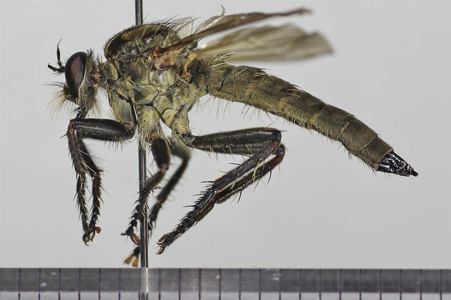 私にはチャイロムシヒキ Eutolmus brevistylus の♀に 見えるのですが、脛節の色は明るい褐色でしょうか? ムシヒキアブ図鑑のチャイロムシヒキの画像が参考に なると思います。 http://www3.kcn.ne.jp/~tgw/m-index2-j.htm ケンセイ@自宅 バグリッチ様レスありがとうございます。 体長は18mmです。 スケール入りの横向き画像を載せます。 ♂もあれば良かったのですが、採れたのは♀1頭だけでした。 ケンセイ様 大変お忙しいところ、レスありがとうございます。 脚は脛節の一部を除き、ほとんど真っ黒です。 もしかしたら、黒化個体なのかもしれません。 ムシヒキアブ図鑑のチャイロムシヒキとも、腹端の形態が違っているように思いますが、これも変異の範疇なのでしょうか。