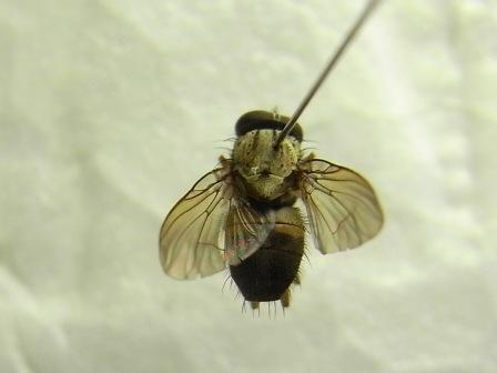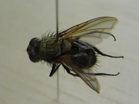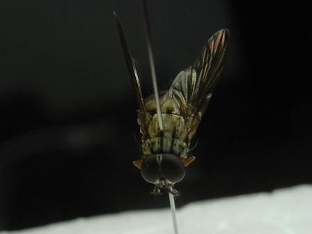 せっかくの写真ですが、この二枚は焦点深度が浅い(ピントが甘い)、照明の方向が不適当、のために科の見当が決定的には付けられません。クロバエ科ではM1脈が中ほどで強く前方に屈曲するのですが、それも写真では不明瞭です。