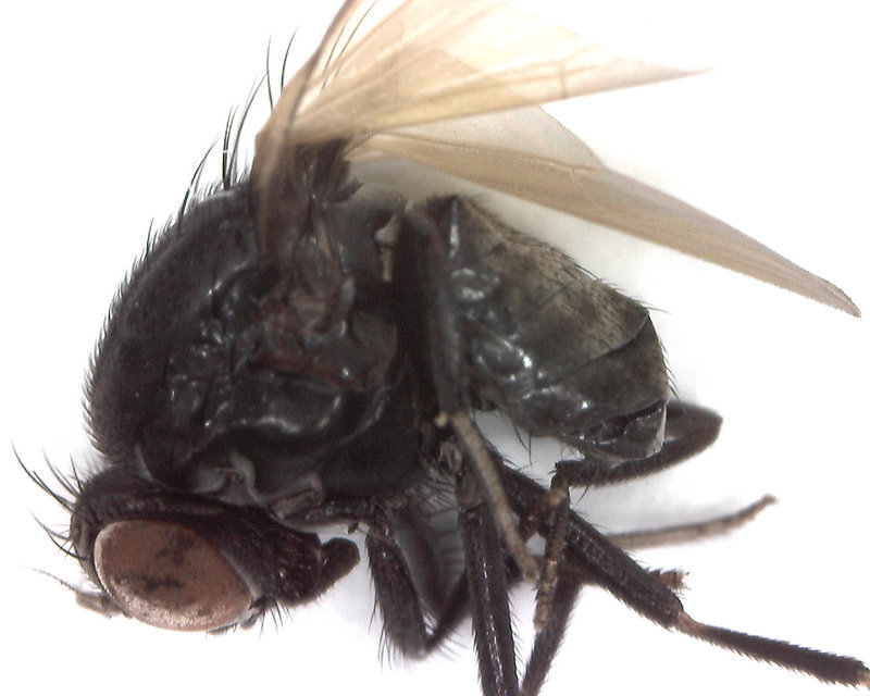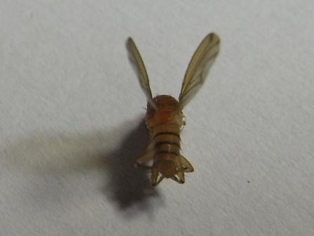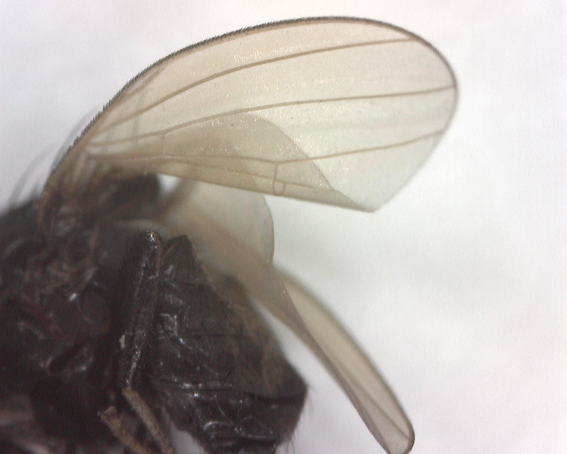 多くの双翅類は採集して死んでからあまり時間がたっていない(数時間以内)時には、胸部筋肉が死後硬直していて、翅が静止しているタテハチョウのように背中に立ててあるか、あるいは「はがいじめ」のように腹側になっている場合があります。この時間内では、体が硬直していて、翅は二つのいずれかの姿勢を取っていて、翅がだらだらとは動きません。前者の場合にはそのままの状態で標本作成ができます。後者の場合には字で書くのは少々難しいのですが、体を仰向き(背中を下)にして)、紙の上に置き、細いピンセットで両翅の根元のすぐ上(体が仰向きですから、翅の根元の上になります)を軽く挟んで、そのまま胸を弱く紙に押しつけると、瞬間的に翅は背中側に反転します。これは何度か大型のハエ(クロバエ、ニクバエなど)で練習してみると習得できます。なぜこのようになるかと言いますと、ハエの翅の根元の関節には弾力性のあるクチクラの構造があって、胸部の飛翔筋の収縮との関連で、この部分で翅が上下に瞬間的に反転するようになっているからです(詳しいことは説明が錯綜するのでやめておきます) 。 このようにして、翅を背中側に反転させておくと、そのままの姿勢で乾燥します。 ただし、死後半日以上位たつと、胸部の筋肉が弛緩して(その前は死後硬直している)、弾性クチクラの働きがうまく利かなくなり、翅はだらだらとなります。もちろんこの状態で、翅を背中側にピンセットで合わせて、その姿勢で三角紙などに挟めば、その状態で乾燥します。 なお、乾燥してしまったハエは以上のことはできません。当たればあたるほど標本を傷めるだけです。乾燥したハエは脚でも触角でも大変壊れやすいので丁寧に扱わなければなりません。 市毛様、アノニモミイア様、ありがとうございます。早速、翅をくるんとさせようといろいろ頑張ってみましたが、 足が取れたり、頭が取れたり、ぼろぼろになってしまいました。悔しいですが、そのまま台紙に貼り付けて標本にしようと思います。もう少し大きなハエで練習してみます。アノニモミイア様のおっしゃるようにニクバエ辺りで…。 悔しいですが・・・ ボロボロになっても翅が反転してくれなかった2枚目の画像の翅です。 不器用な私ですが、懲りずにこれからもご指導くださいませ。