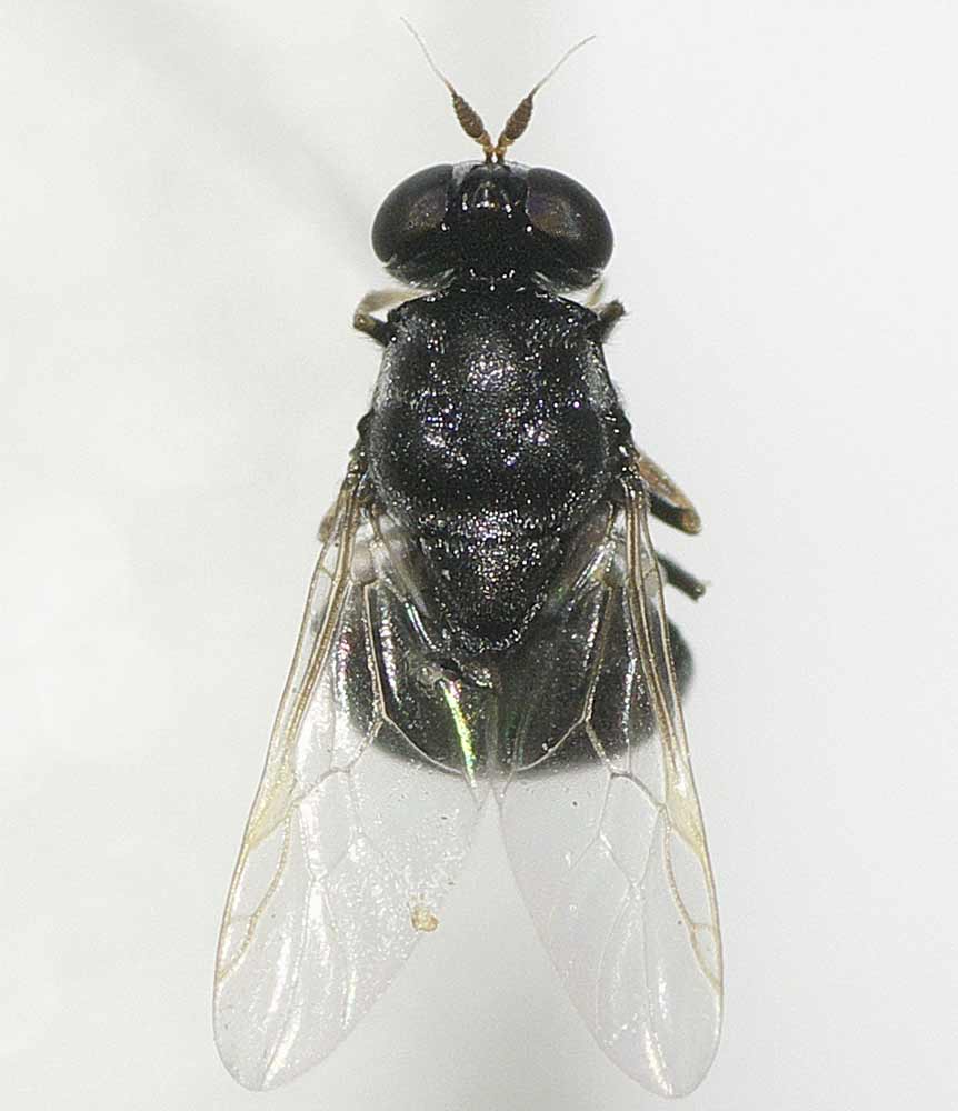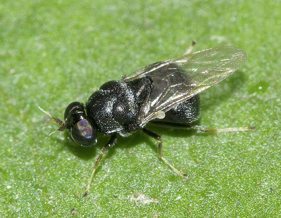 以前、我が家で撮影したミズアブ科Pachygasterinae亜科のKolomania albopilosaに付いてお訊ねしたところ、ケンセイ様より東京都本土部昆虫目録に載っていないので「はなあぶ」などに短報を書いていただけないか、と云う御話がありました。この時は写真だけで虫体を確保しておりませんでしたのでお断りしたのですが、先日(2011/07/10)、我が家(東京都世田谷区西部)のカラスザンショウの葉上に似た様なミズアブが居たので、恐らくK. albopilosaであろうと思い、マクロレンズで覗いて確認する前に網を振ってしまいました。それが、写真のミズアブです。しかし、管瓶に生きたまま入れ、メガネを掛けて観察したところ、腹部の白毛帯がありません。後で、写真を撮ってみると、触角の色も全く異なり、鞭節の先から黄白色の刺毛が伸びています。 Manural of Nearctic DipteraでStratiomyidaeを検索すると、何と、日本に記録のないBerkshiriaに行き着いてしまいました。Diptera info、BugGuide.net等で調べると、胸背の瘤、触角の形態や色、脚の色など、実際よく似ています。 しかし、このManualには、Kolomaniaは載って居らず、Kolomaniaを検索するとCosmariomyiaに辿り着きます。検索表が古いのか、分類に異説があるのか分かりませんが、他に文献を知らないので、これ以上の判断は私には無理の様です。 一体、このミズアブは何属なのでしょうか。宜敷御教示下さい。
