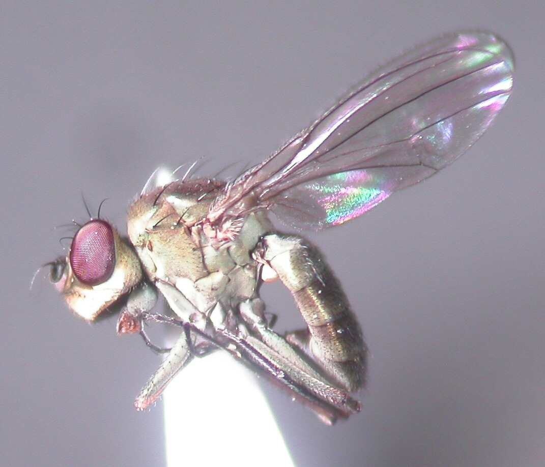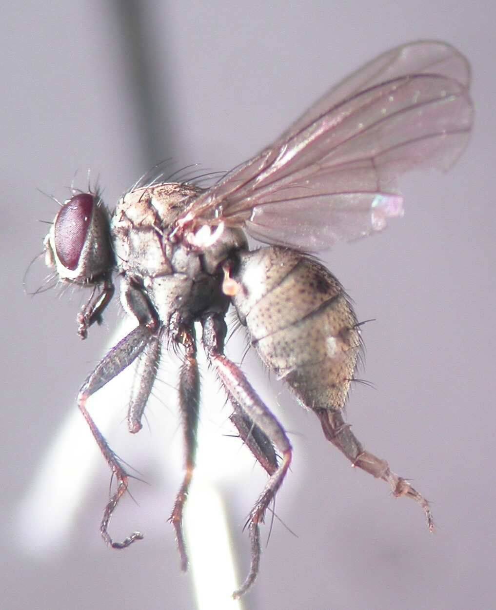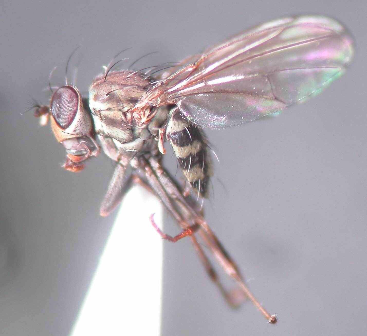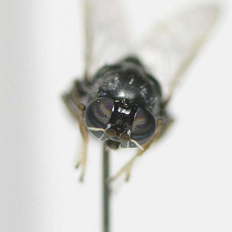こちらは、北大を貫通して流れるサクシュコトニ川の出口のヨシやガマが生い茂る湿地と大野池の双方でのスウィーピングサンプルで優占して出現した Notiphila (Agrolimna) sp. の♂です。まだ種までは落とせておりません。