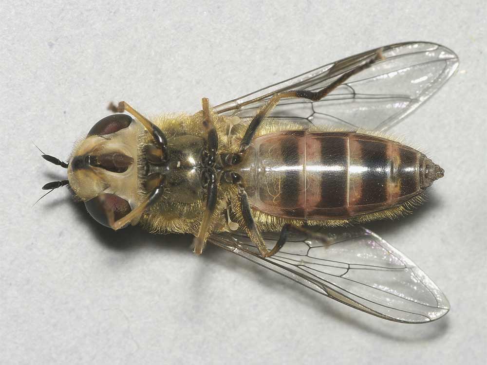 さて、この写真で見ますと2nd basal cellの前半分は微毛がないように見えます(cu脈沿いには見えますよね)。1st basal cell(一つ前側の擬脈が走る部屋)や周辺のcellも無毛部が多いようですので、この標本はホソオビヒラタアブの方ではないでしょうか。