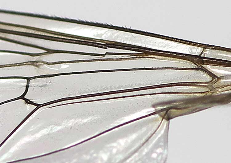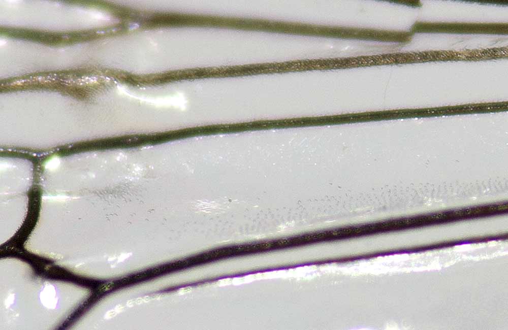 色々な方向から写真を撮ってみましたが、翅が光を反射して中々良い写真が撮れません。後斜めから撮ったのが左の写真です(右の翅は小翅片が折れて第2基室に少し重なってしまったので左の翅で撮りました)。M3+4脈の上に見えるのが、問題の微毛でしょうか。