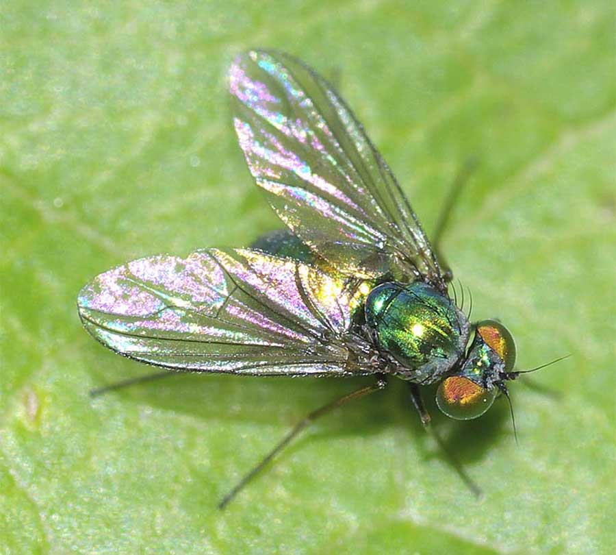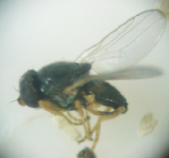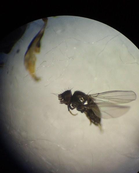 ハエは体長2mmほどで、触角が角度によって勾玉型に見えます。
