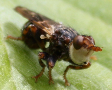 「Manual of nearctic diptera」で検索してみると、「1. Vertex of head deeply excavated as seen from anterior view (Fig. 2). Scutum often as wide as long. M usually with a widely divergent fork (Fig. 2l) ......2、2. M unbranched,lacking posterior branch (Fig.22)...............Mesorhaga Schiner」で、簡単にMesorhagaに落ちてしまいました。