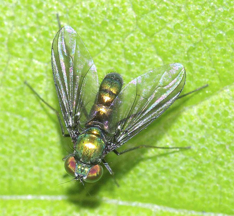 一昨年の夏に、Web上で「アシナガキンバエ」とされているアシナガバエが、本当は別の種ではないかと思いお尋ねをしたところ、三枝先生の御尽力により、アシナガキンバエとは亜科も異なるChrysosomaの1種であることが分かりました。