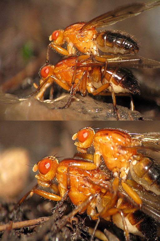 おー、やっと通った!スパムフィルタに弾かれて悪戦苦闘しております。 林道上に下痢便の獣糞が小さな水溜まりのようになっており、集ったハエが交尾していました。 下の♀は口吻を伸ばし断続的に獣糞を舐めています。 横から見ると交尾器は結合していません。