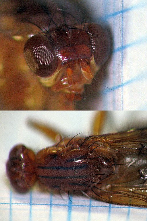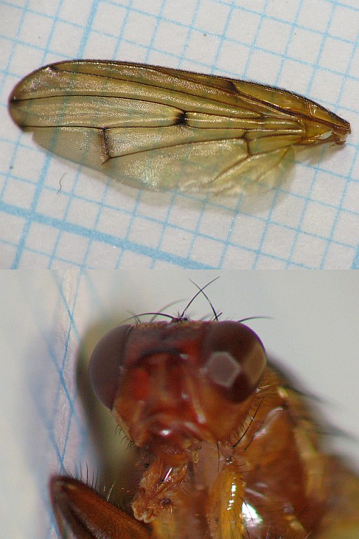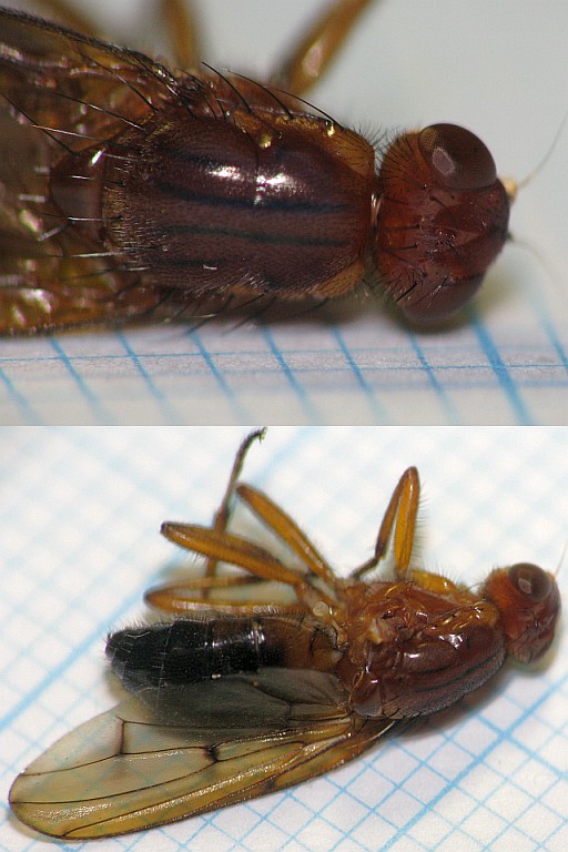 ワタナベベッコウバエNeuroctena ecalcarata (Kurahashi, 1981) ではないでしょうか。 本種はDryomyzaで記載されましたが、Ozerov (1999)などはNeuroctena属にしています(ベッコウバエN. formosaも同様)。翅の横脈に暗条がないこと、腹部基部を除いて背板の大部分が黒褐色である点が本種の特徴です。本種は本州中部の山や北海道の山の材料で記載された種で、私の標本もマウントしたものに限れば山梨の増富や月山のものです(他にもたくさん採集していますがマウントしていないので産地はわかりません)。 原記載は、 Kurahashi, H., 1981. A revision of the genus Dryomyza(Diptera, Dryomyzidae) from Japan. Kontyu,Tokyo. 49(3):437-444. です。CiNiiで無料でpdfがとれます。