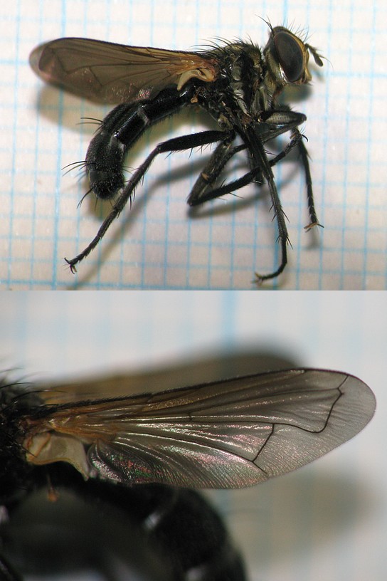 少なくともニクバエ科ではないと思います。 「みんなで作る双翅目図鑑 画像一括閲覧ページ」を見ると、 ヤドリバエ科によく似たのがいますね。 シロウトの助言ではこれが精一杯。。。