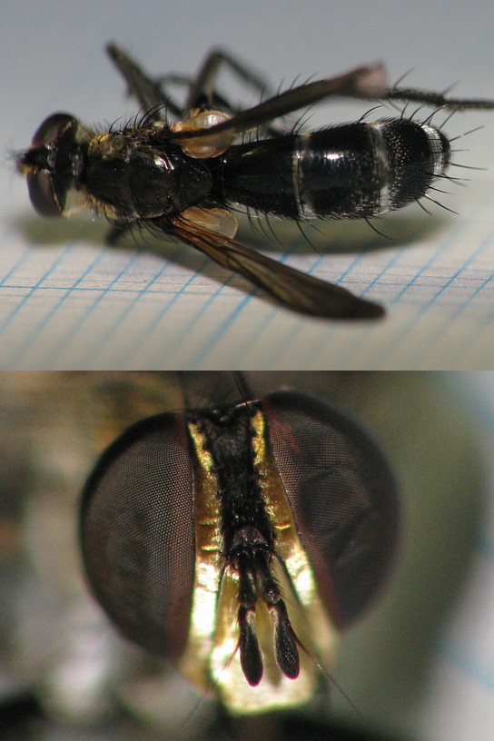 更に調べると和名も判明。 ヒョウタンハリバエ Cylindromyia (Malayocyptera) pandulata (Matsumura. 1916) 今回はCylindromyia sp. としておくのが無難ですかね? ここまで調べたところでアノニモミイアさんの回答を頂戴しました。 ヒョウタンハリバエはPhasiinae ヒラタハナバエ亜科に属すらしいので、どうやらナガハリバエ類とはまた違うようです。 ナガハリバエ類とはDexiinae アシナガヤドリバエ亜科の仲間と理解しました。(違ってたらご指摘願います)