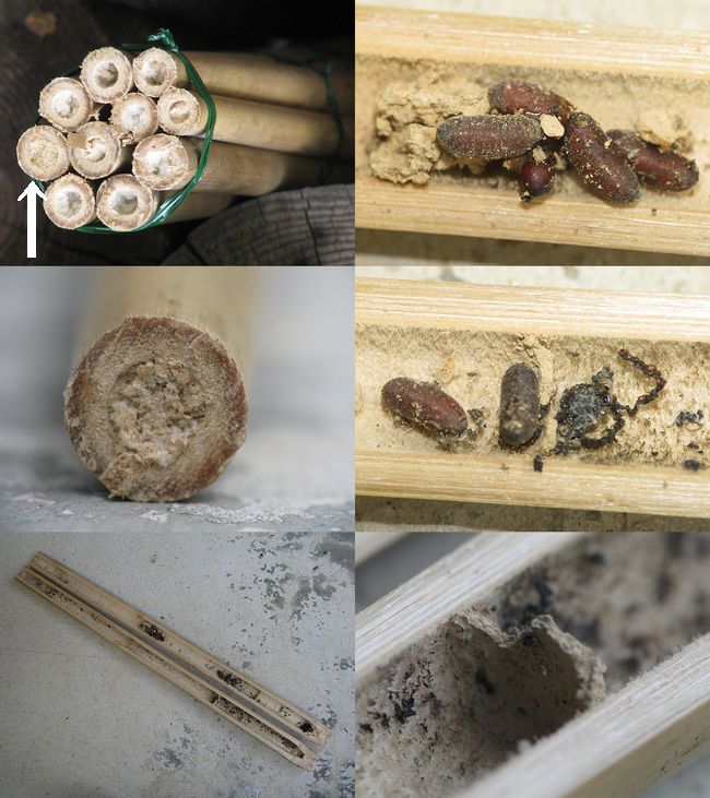 こんばんは。ドロバチに寄生するハエについてお尋ねします。 この夏、借坑性の蜂を観察するために竹筒トラップを2束仕掛けました。(里山の麓@山形県) 8月上旬、泥で封じられた一本を割ってみました。 独房内に蜂の子や貯食物は残っておらず寄生虫の蛹が数個転がっているだけでした。 同じ頃、隣の竹筒束ではオオフタオビドロバチの営巣活動を直接観察していますので、寄主はおそらくこれだろうと思っています。