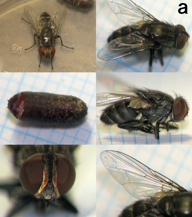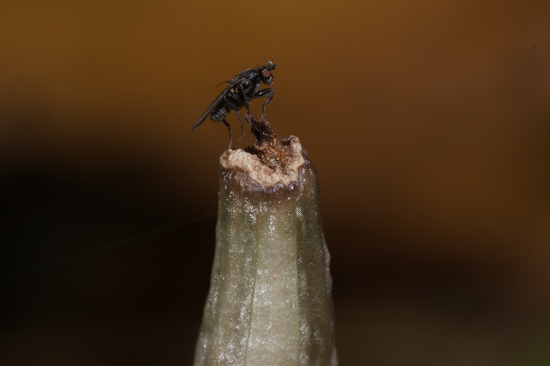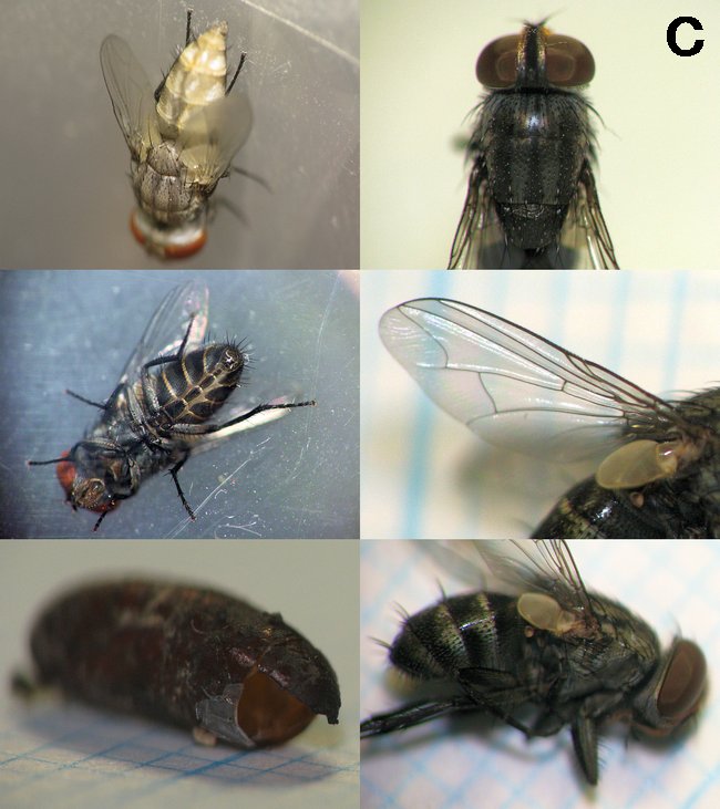 とても丁寧に解説していただきましてありがとうございます。 交尾器を自分で調べるスキルは未だありませんが、どうやらドロバチヤドリニクバエで良さそうですね。 今回、羽化直後の成虫が翅を延ばす様子を観察することが出来ました。 気になったのは、頭頂部で風船のような膨らみが脈動していた点です。 本で調べたらこれを使って蛹の殻を中から割り、更にはドロバチの巣も破るのだそうですね。 一見弱々しいハエにそんな力があるとは俄には信じがたいですけど、ツリアブの仲間とはまた違った脱出戦略に感動しました。 蜂の泥巣に寄生するヤドリバエやツリアブの生き様はまるで密室殺人の鮮やかな完全犯罪トリックのようで、とても面白いです。 |
