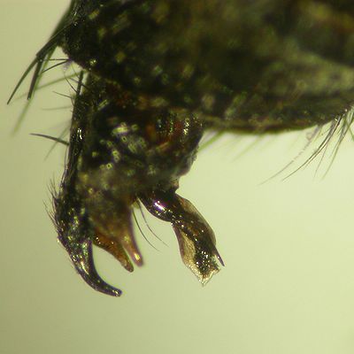 http://www.ffpri.affrc.go.jp/labs/seibut/bamboohymeno/species/amobia-distorta/0001.html そうですね、たぶんドロバチヤドリニクバエでよいと思います。少なくとも、外形からはAmobia属に見えます。今のところ、国内のAmobia属はドロバチヤドリニクバエ1種だけのようなので、いいかな?とも思うのですが、ニクバエの同定は♂交尾器を見ないと安心できないので、たぶん・・・です(^^;)。参考として、♂ゲニタリア画像を貼っておきます。ちなみにAmobia属は、他のヤドリニクバエ類に比べて、頭の形が丸っこいのと、額の幅が狭くて、細くて短めの眼縁剛毛が列生しているのが特徴的です。Kurahashi(1970)に頭部の図があります。CiNiiで閲覧できますので、ご覧になってみるとよいでしょう。 Kurahashi Miltogramminae をキーに検索するとその論文がヒットします。 なお、ドロバチヤドリニクバエの学名について、 T. Pape氏の説に従えば Amobia distorta (Allen, 1926) は Amobia oculata (Zetterstedt, 1844) のシノニムということなので、現行では A. oculata ってことになります。