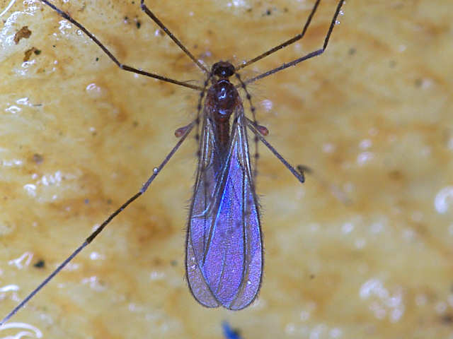 タマバエ科であることは間違いないのですが、重要な形質である付節の基部の状態が写真ではやや不明瞭です。しかし、3枚目の写真の左後脚の付節基部をよく見ると、付節幅の3倍くらいの部分でくびれないし色調の差が生じているように見えます。おそらくこの部分が第1付小節と第2付小節の分節部と思われます。そうであれば、写真の種は日本産タマバエ科の3亜科のうちのLestremiinaeではありません。残りはPorricondylinaeとCecidomyiinaeです。翅脈の状態から判断するとPorricondylinaeでしょうが、属までは画像だけでは判断できません。