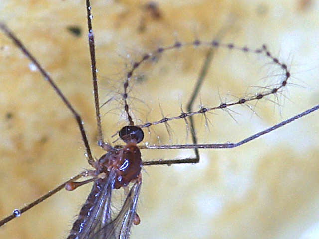 タマバエ科の多くは触角鞭節の各小節がこのように変形して、多様な形状の刺毛を生じます。写真の種のように、各小節の基半部が太く、先が細く円筒状になる傾向は、クロキノコバエ科SciaridaeのZygoneura属などでも起こりますので、この特徴だけでタマバエ科と判断するのは早計ですが、多くはこの特徴でタマバエと推定して間違いないでしょう。