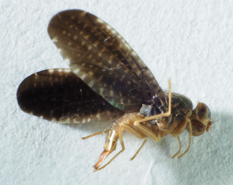 翅の中程と翅端の斑紋の形と,翅脈がしっかり見えないと種まで判別できません. 下記を参考文献にしてください Krivosheina, N. P. and Krivosheina, M. G. 1997. New Data on Palaearctic Species of the Genus Euxesta (Diptera, Ulidiidae), with Description of a New Species, Euxesta freyi. Ent. Rev., 77(9):1223-1228. Kameneva, E.P. 2000. New Synonyms of Euxesta pechumani (Diptera, Ulidiidae). Vestnik zoologii, 34(4-5): 16.