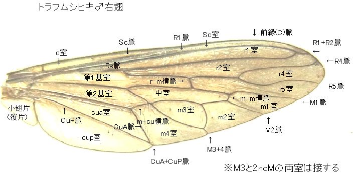 新訂原色昆虫大図鑑第3巻でムシヒキアブ亜科のトラフムシヒキを調べました。同書では,「R4脈はR2+3脈とは独立に翅縁に達するために亜縁室は2室」がムシヒキアブ亜科の特徴と出ています。また,トラフムシヒキの「M3と2ndMの両室は接する」と解説されています。トラフムシヒキの翅脈図を試作してみましたが,R2+3脈や2ndMはどこにあるのでしょうか? また,M3はm3と小文字を使うべきなのではと思いますが,いかがでしょうか?
