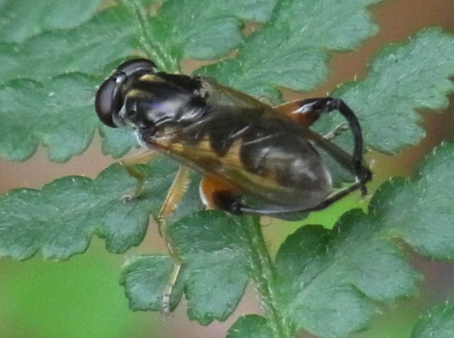 このハナアブは、ハラアカハラナガハナアブ:Chalcosyrphus (Xylotomima) frontalis (Shiraki et Edashige, 1953)のメスです。 ハラナガハナアブ属の中では比較的ポピュラーな種で、各種の花に来ています。出現期間も春から夏までと長いので、フィールドで出会う機会も多いんでしょうね。