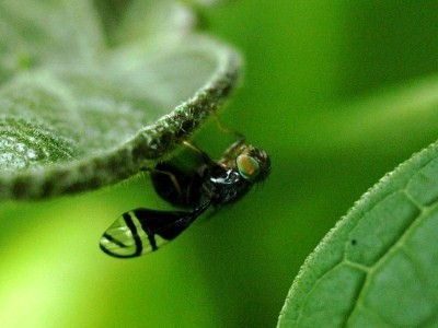 5月中旬、ベッコウバチ(クモバチ)科のヒメベッコウ(Auplopus carbonarius)が作ったと思われる泥巣を発掘しました。(里山の参道に立つお地蔵さんの背中@山形県飯豊町) 育房から採集した6個の繭を個別に飼育してみたところ、寄生されていたようで6月下旬になってツリアブが2匹羽化して着ました。 この組写真は繭#1から羽化した個体です。 羽化直後(左)は翅の黒色が薄いようです。 数日間容器内で飼育して成熟を待ってみたら翅が擦り切れてしまいました。