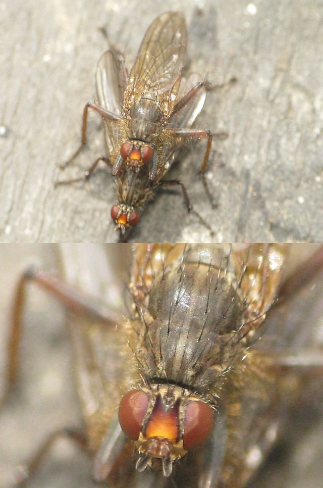 写真のハエはフンバエ科Scathophagidaeのヒメフンバエ属Scathophagaの1種です。本属には日本にも数種が生息していて、私には写真だけでは同定できません。ヒメフンバエScathophaga stercoraria (Linnaeus)の可能性が高いでしょうが、雄は大型の個体ではいま少し黄色の長軟毛が体や脚に密生しています。
