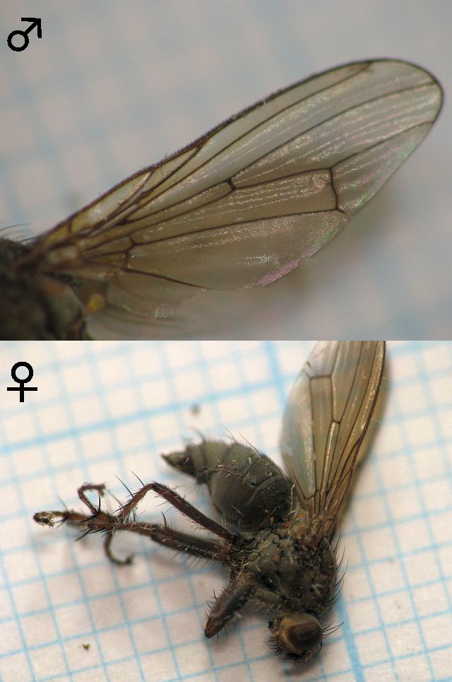 ♂個体も採集しているようなので、♂ゲニをごらんになってはいかがでしょうか。フンバエ類は結構はっきりした違いが出ていると思います。