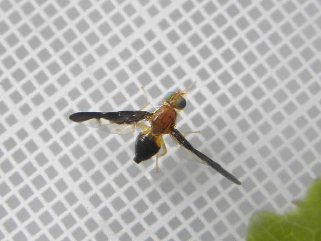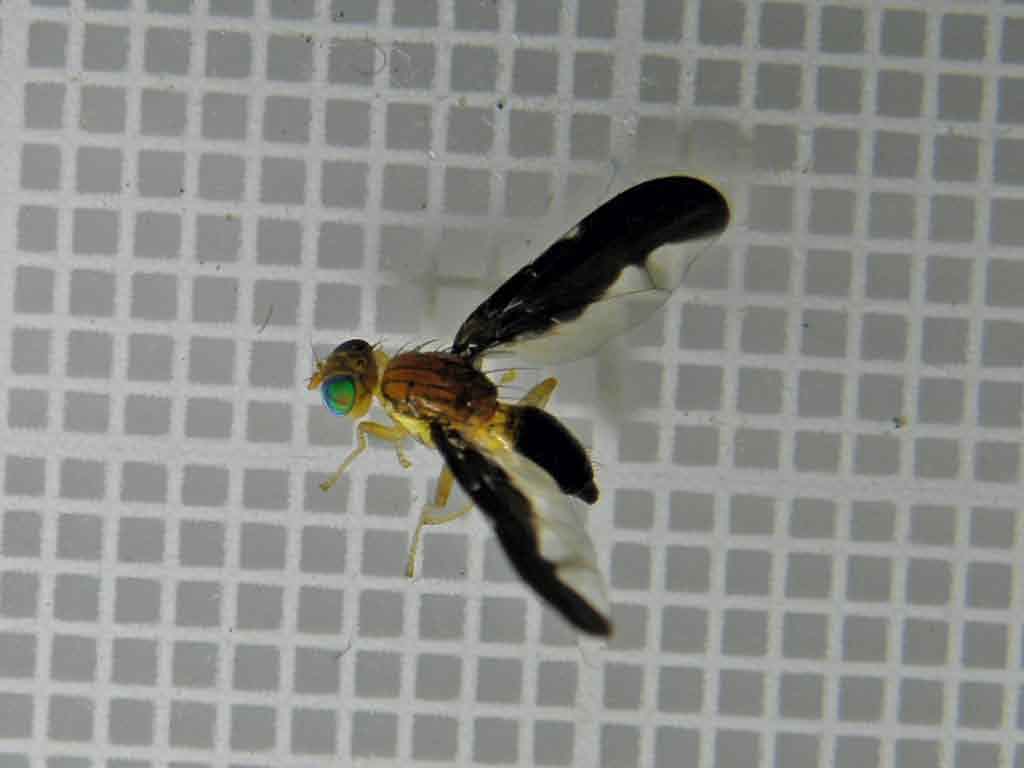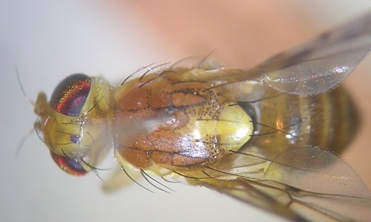 学問的には、見た目ではなく、文献などを参考に、しっかり確認しなければならないことが、なんとなく分かりました。厳しいものですね。 さて、添付していただいた図(頭部及び翅)については、この個体についても確認できるようです。特に、下額眼縁剛毛については、どれだか良くわからなかったのですが、3対、後向きであることが確認できました。 ドイツ語の解説のほうはお手上げなのですが、肩から翅の付け根まで淡い黄色、肢は明るい黄褐色などは同じようですが、中胸盾板については、鮮やかな赤黄色とはいえても、2対の縦の打ち跡?などは分かりません。何か模様があるようなのですが、この記載では4本の模様のように読めます(訳があっているのか不明)? タラノキハマダラミバエは、大きさや翅の模様なども似ているようですが、中胸盾板前端から後端に達する1対の暗色条を持つとされているようです(原色昆虫大圖鑑3)。 この綺麗なミバエ科の類も、名前までは、なかなかつかないようですが、色々ご教示ありがとうございました。