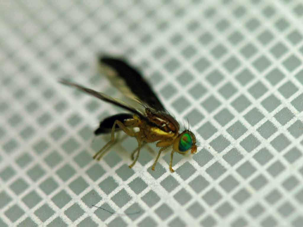 連続で恐縮ですが、また、複眼の緑が綺麗なハエがいました。体長5mmで、茨城の県南でフキの葉の上でうろうろしていました。 体長、翅の模様などからは、タンポポハマダラミバエと思われます。問題は中胸盾板のやや細い3本の筋模様などですが、図鑑では、明確には記載されていません。 しかしながら、クサギハマダラミバエははっきりした4本の黒条だけ(みんなで作る双翅目図鑑)ですし、市田忠夫さんも関係している「あおもり昆虫記」のタンポポハマダラミバエも拡大すると筋模様が入っているように見えます。 タンポポハマダラミバエでよいでしょうか、それとも、未知の種なのでしょうか?また、尾部の形状からこの個体は雄なのでしょうか? よろしくご教示のほどお願いします。