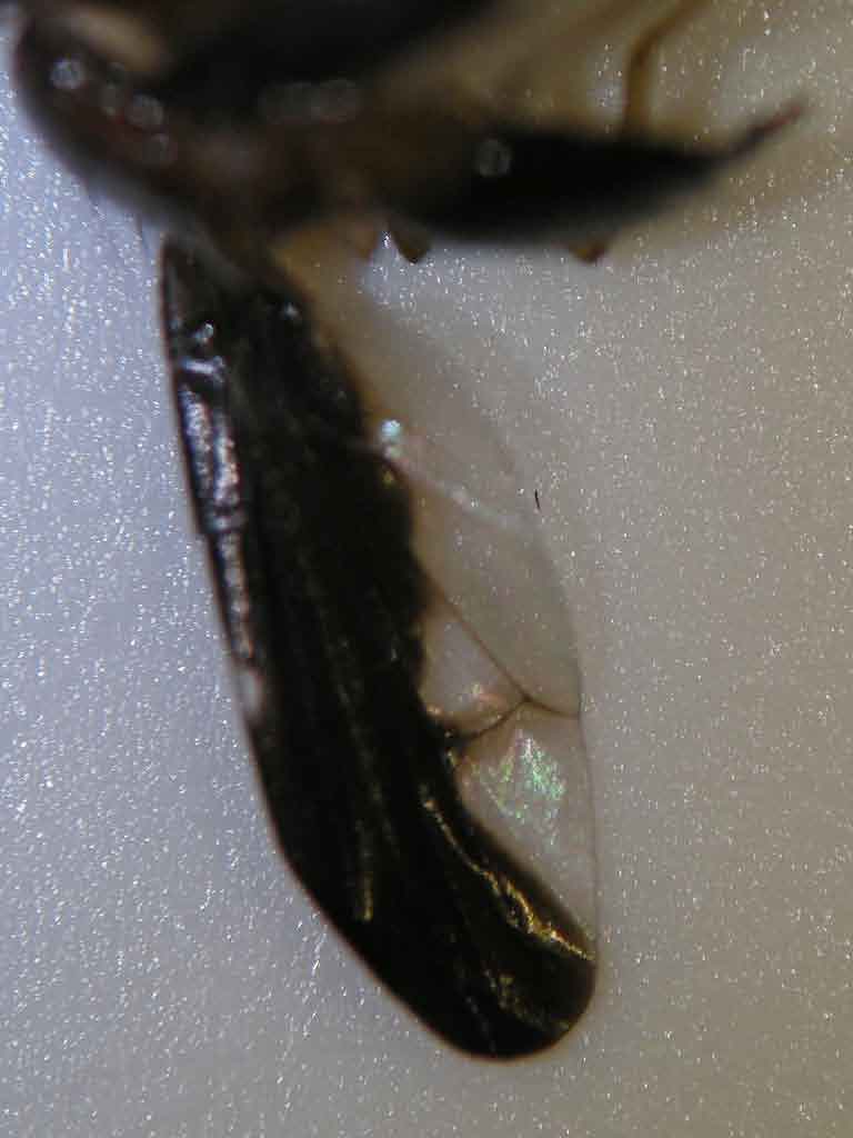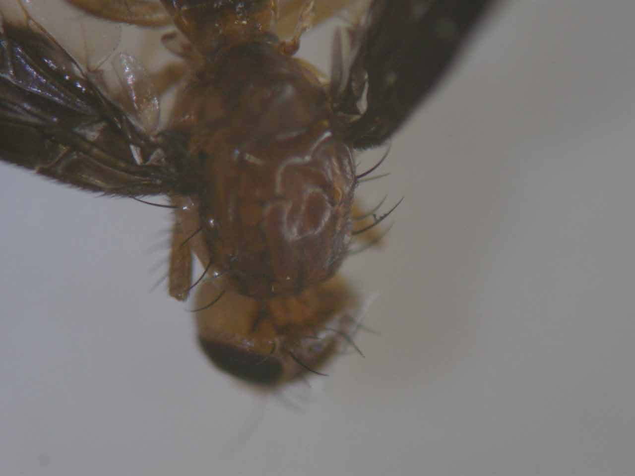 なんにでも興味があるほうですので、耳が痛いです。 これまで以上に注意をしていきたいと思います。 こんにちは。このあたりの種を採った つたない経験からしますと、標本になった時に、胸部背面の斑紋がすっかり消える種がいます。 たとえば画像は Vidalia sataeに似た翅斑の不明種ですが、この種の胸部背面の斑紋は、標本にすると完全に消失します。 (画像は 針に刺した直後の個体で、まだ斑紋ははっきりしてます) このような、生時だけの斑紋が、どのように記載されているかはわかりませんが、ミバエの場合には注意が必要と思っています。 yamasanaeさんのミバエも標本なった後では斑紋が変化するかもしれません。どうでしょうか? |