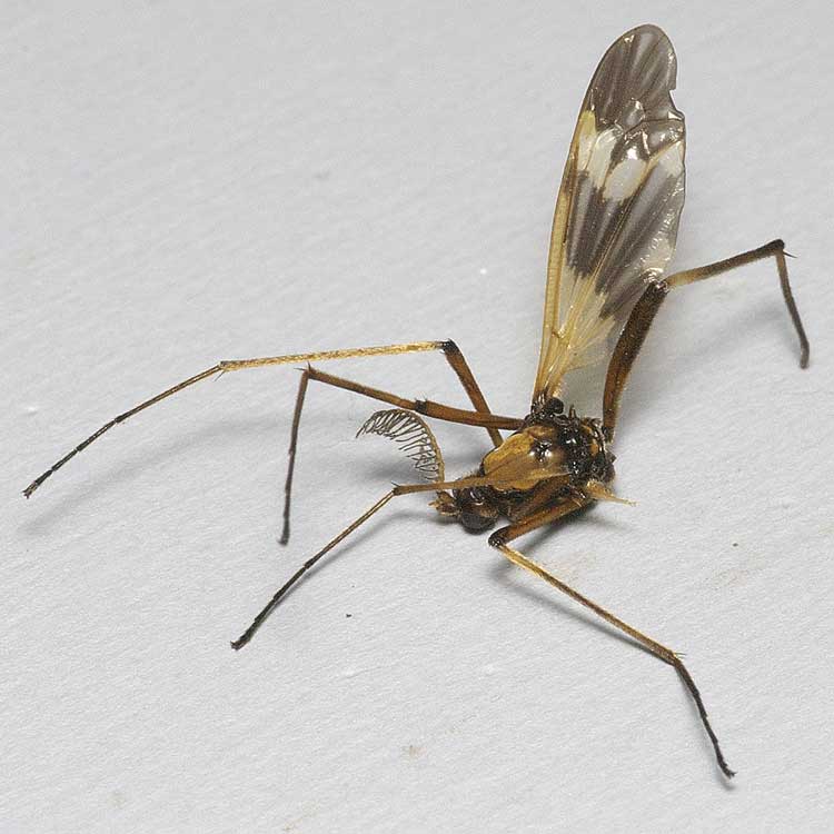 Fly Timesに載せた写真のような霞のごとく現れることもあるし,小さい群飛の場合もあります。ユスリカのようによくまとまった群飛の中で特定の飛翔様式をするのではなくて,どちらかと言えばアブラムシの有翅虫が空中を漂うような感じです。 それと,ネットにいれてもほとんど動き回らず,そのうちに腹部を胸の下まで丸くまげて弾力をつけた後に空中に飛び上がります。ネットの中では一見イネ科植物の微細で細い葯が付着しているような印象です。体調は2mm弱で微小ですが,やや褐色です。翅は胸の上に常に立てていますが,肉眼ではあまりよく見えません。この点もユスリカとは全く異なります。 皆さんの場所で是非探してみてください。四国,九州,東北等は本科が未発見です。 幼虫もベントスの材料の中で見つかります。体長2mm弱の細長い幼虫でして,胴はユスリカなどに似てほとんど無色ないし淡い白色,腹部に8対の長い腹脚を持っていますので,あらゆる水生昆虫から確実に区別できます。腹脚の長さは体の厚さにほぼ匹敵しますので,ずいぶん長い脚を持っていると言う印象を受けます。