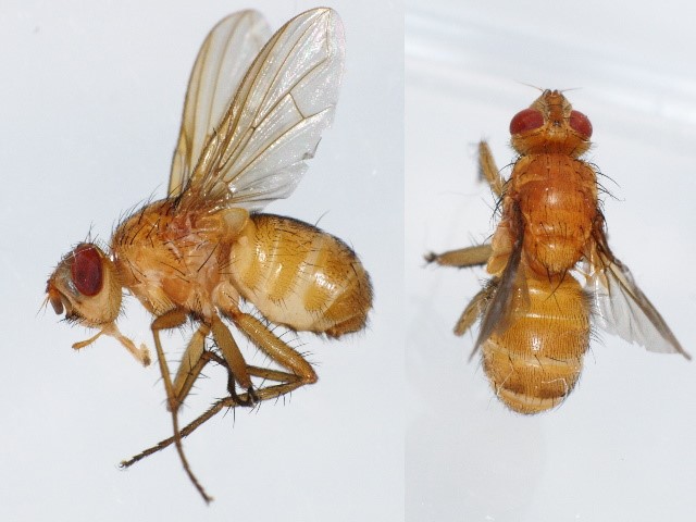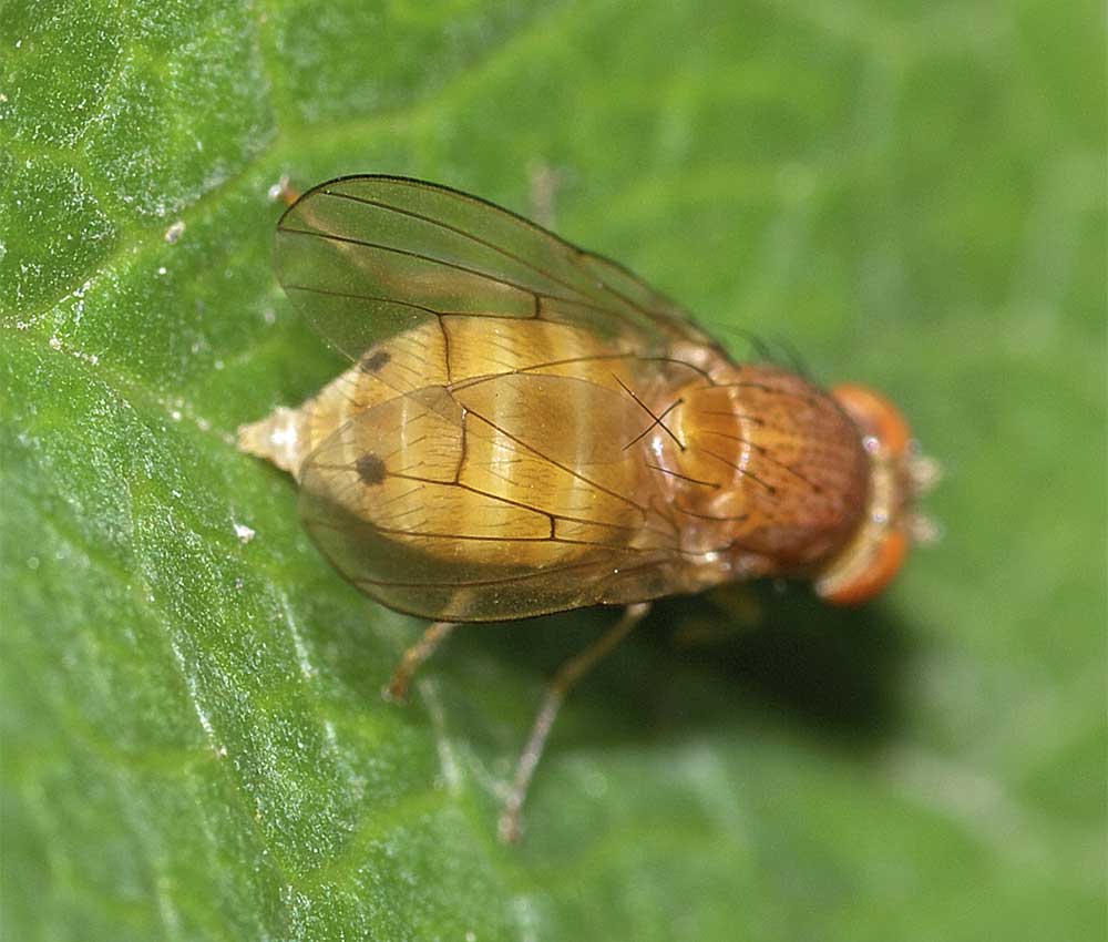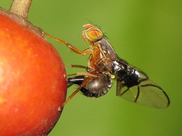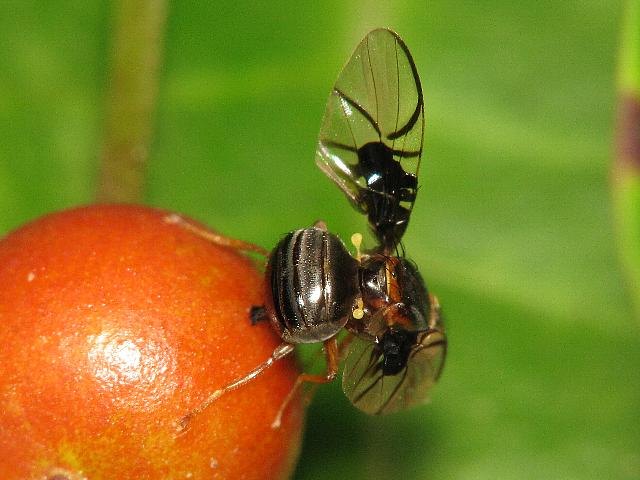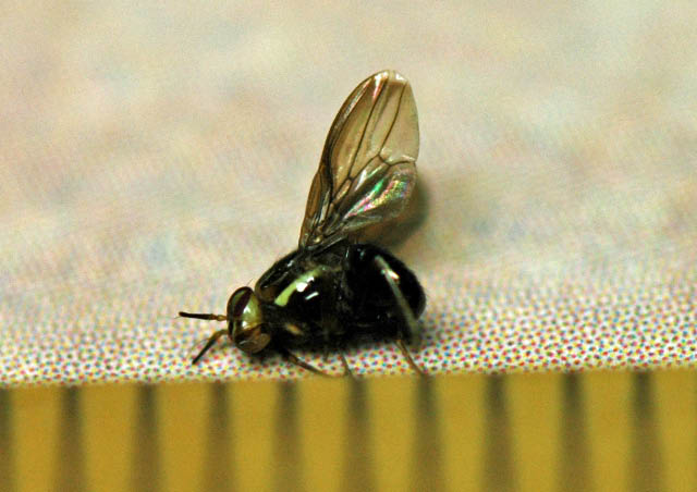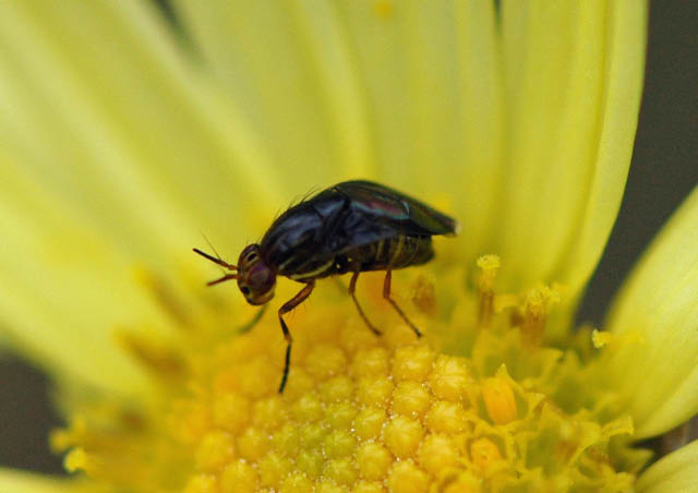 径室に透明紋がないので、クロハススジミバエ Anomoia permunda によく似て見えます。生態写真ですし、私の手持ちのミバエ標本も充実していないので確定・・・とまでは言い切れませんが。
