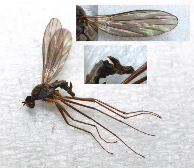 かなり変わった♂交尾器ですね. 三枝先生のコメント待ちですが,とりあえずオドリバエ科のKowarzia属に一票入れておきます.