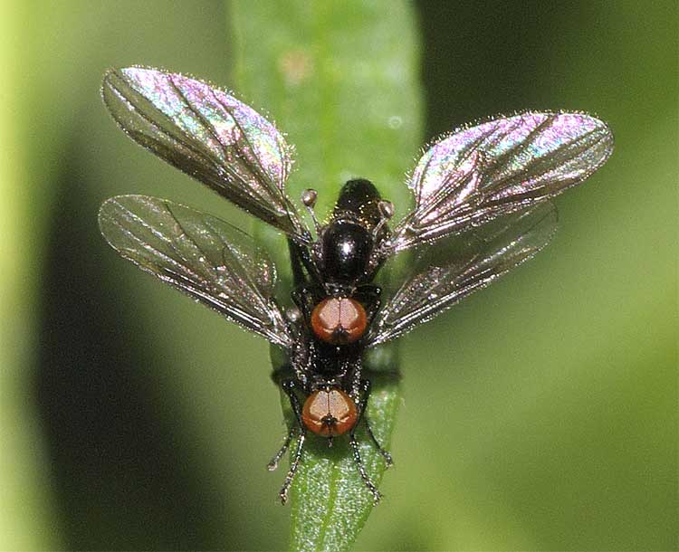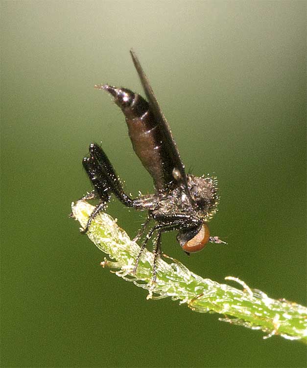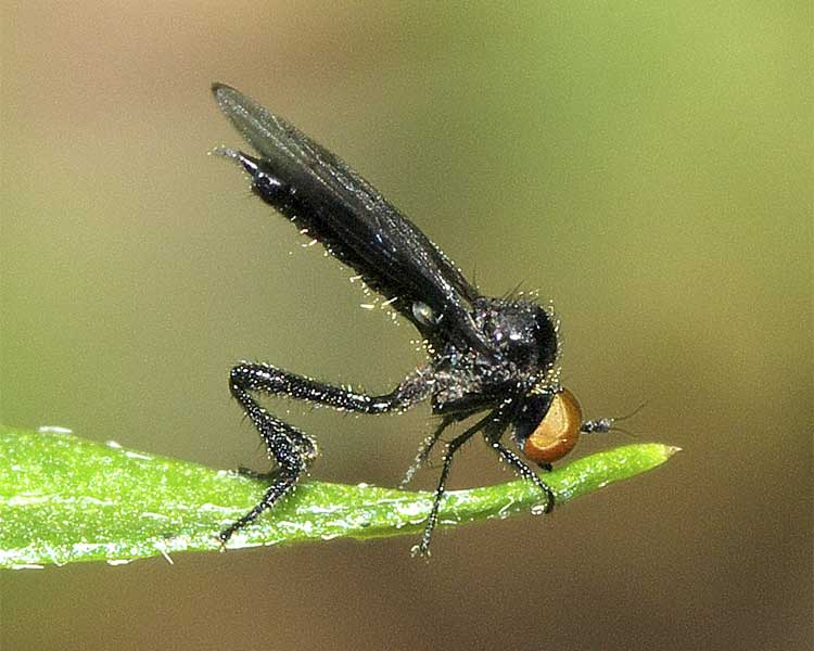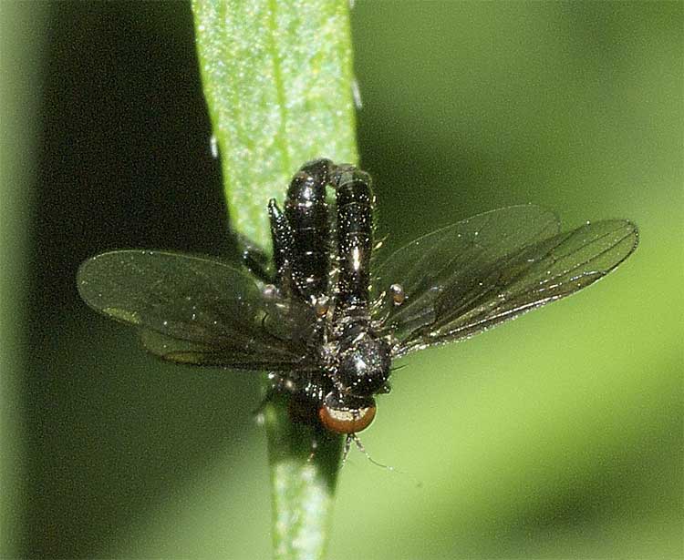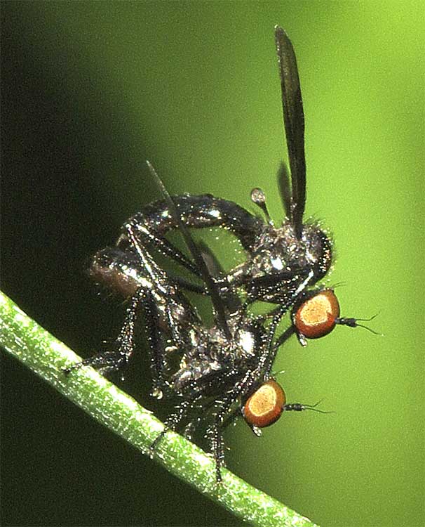 旧北区はS. nigripes1種のみでして、日本産のものもこれに同定できると思いますが、まだヨーロッパのものとの交尾器などの比較を行なっていません。本種は日本では平地から山地まで広く分布していて、どちらかと言えば谷地のような環境を好みますが、平地のちょっとして木立などでも見かけることがある普通種です。 熱帯には更に多くの種が生息していまして、これらの多くは翅のmicrotrichiaの発達が悪く、いわゆるガラス状透明の完全に透き通った感じで、M脈は全く消失しています。ほとんどの種はHybosの一般的なサイズに比べるとかなり小型です。 本種の交尾中のものは観察したことがありませんし、写真もはじめてです。興味深く拝見しました。