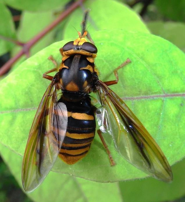 ジョウザンナガハナアブというのですか。普通種…珍しそうでしたが、まあ私の「珍しい」はノコギリカミキリやホソオビヒゲナガが入ります。 私は橙のスズメバチで最もなじみがあるのがモンスズメバチなので、それが第一印象でしたがもっと似るのは仰る通りのキイロスズメバチですね。 飛ぶ音はスズメバチのような恐ろしいものではなく甲虫(というよりコガネムシ?)に近かったです。 この衝撃的なハナアブの名前がわかって爽快です。ありがとうございました。 |