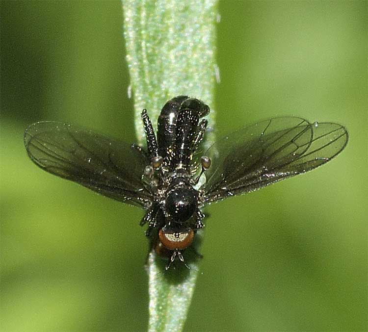 オドリバエ科のClinocerinaeシブキバエ亜科には類似した属がいくつかあって、標本を検しないと正確を期することは難しいのですが、外観からだけ判断しますと、Trichoclinocera dasyscutellum (Saigusa)であろうかと思います。本種はAcanthoclinoceraという属の模式種として記載されたのですが、その後、この属がTrichoclinoceraのシノニムとして消えましたので、上記学名になっています。しかし、前述の通り多分というていどです。