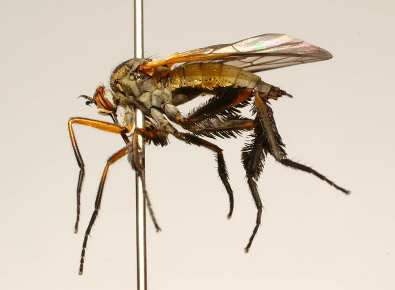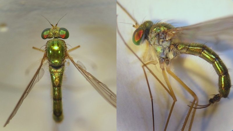 さて、この画像のオドリバエに似たものは、Planempis亜属とPolyblepharis亜属があります。メスの場合には両属はきわめて類似していて、なかなか画像では識別が難しい面があります。Planempis亜属は日本列島では著しく種数が多く、もし、Planempisであっても種までの同定はかなり難しいです。Polyblepharisですと本州の種数は数種ですから種の同定は可能です。 画像でみますと、翅の基半部が著しく黄色味が強いのですが、これは自然の色彩を的確に現しているのでしょうか。 脚の色彩や羽状剛毛の長さや生えている範囲などを、画像から判断して同定する必要がありますので、しばらくお待ちください。 |
