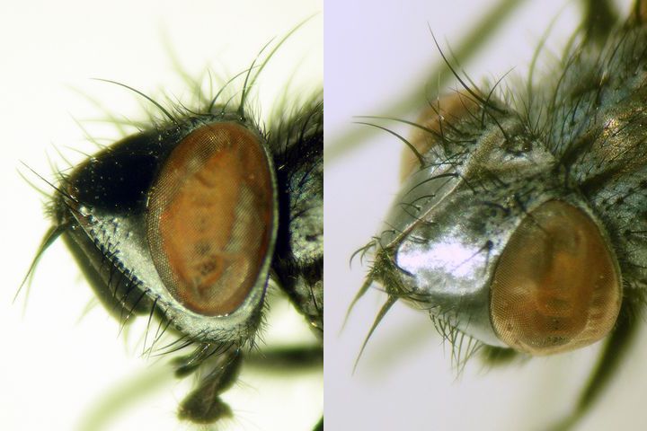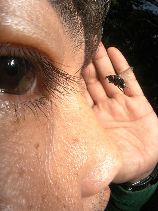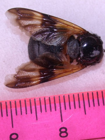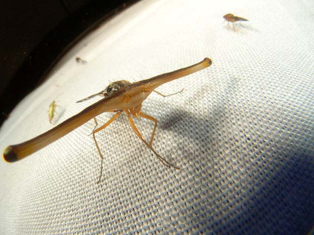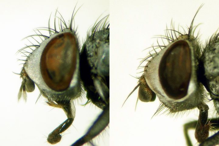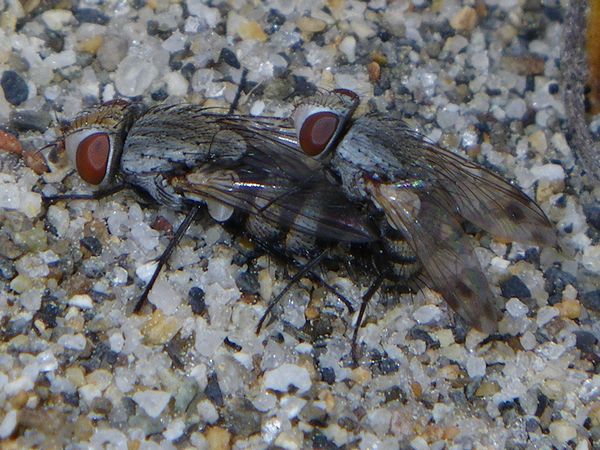 ハネボシスナニクバエが交尾してました。最初に見つけた時は、この後ろにもう1個体くっついていたのですが、撮影しようとしたところ全員で飛んでしまい、最後尾のものは逃げてしまいました。合体した2個体はよたよたと重そうに飛んで、再び砂上に降り立ちましたので、そこを撮影したものです。 新潟市 2009年5月11日撮影 ついでに、双翅目談話会の同定会で、幾人かの方から「ハネボシの♀ってどんなの?」という質問を受けましたので、頭部の比較写真を撮ってみました(左が♂、右が♀)。ハネボシの♀は、アリスタの形状以外は♂とそっくりな外見です。双翅目web図鑑のハネボシスナニクバエの解説にありますように、特に頭部の輪郭がよく似ています。 http://furumusi.aez.jp/wiki.cgi?Sarcophagidae018 ♀のアリスタは・・・先半分が白いという発言もありましたが、確認したところ先半分の色がやや薄くなってはいますが、白いとはいえません。何を見間違えたんですかねぇ・・・すみません(平謝)。 |