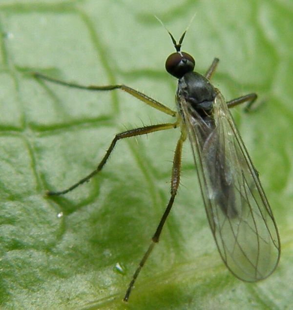 これはオドリバエ科Empididae(またはこれを細分化したセダカバエ科Hybotidae)のLeptodromiella属の1種です。もともとこの属は北欧から記載されたものですが、日本にも数種が生息していて、いずれも未記載種です。