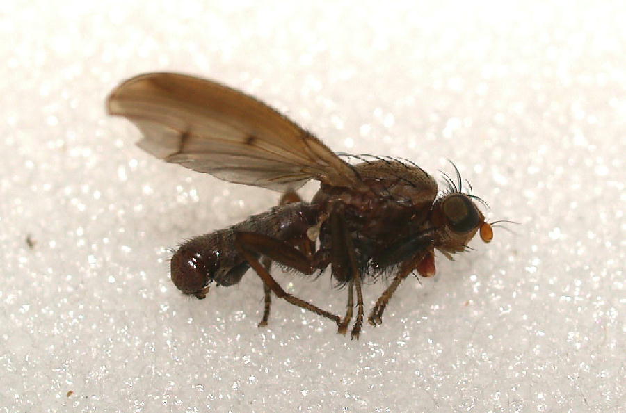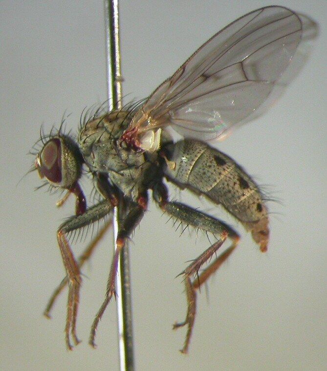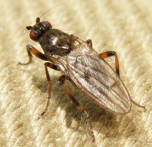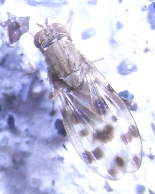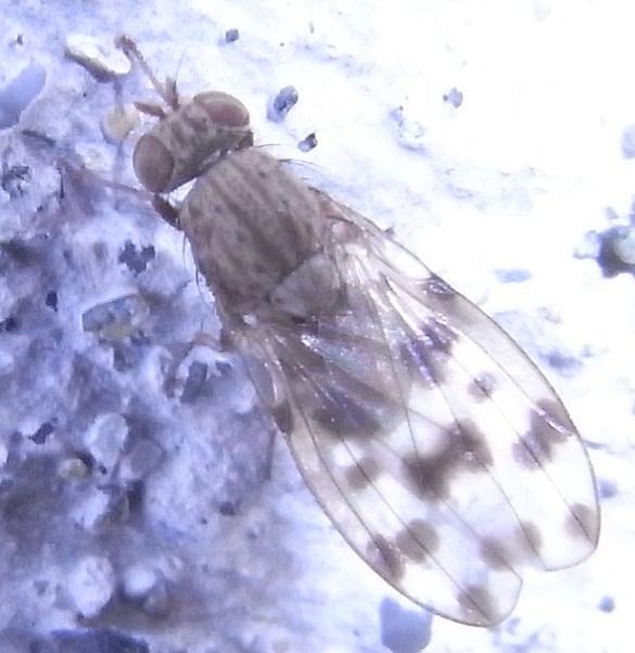 ついに北海道も虫の季節になりました。飛ぶ昆虫はハエ・ハチが中心です。自宅の周辺に飛んできたハエです。翅脈が見づらいですが羽の茶色いまだらが特徴的です。 羽は腹端をかなり越えます。このハエは何でしょうか。4月3日、札幌市、体長約6mm