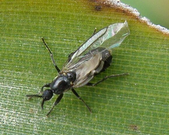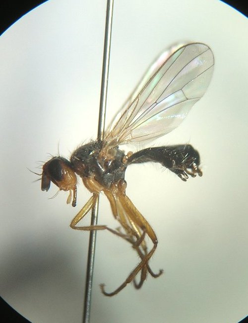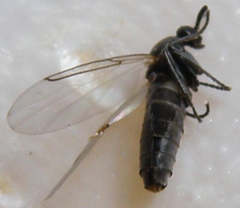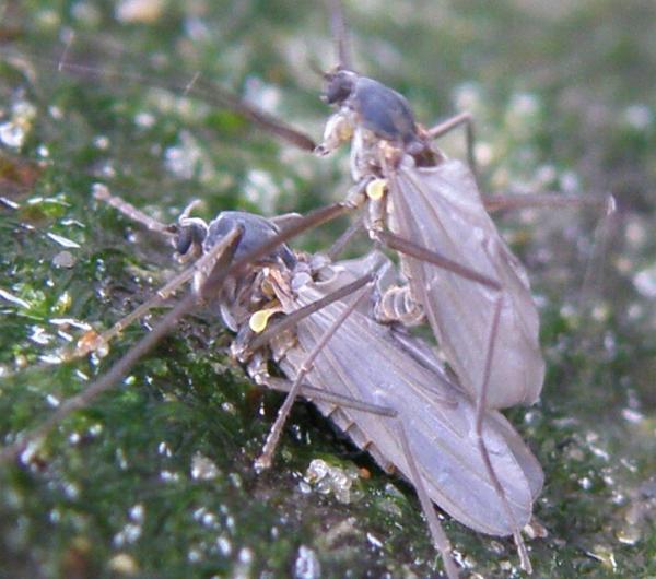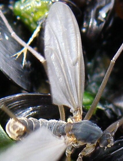 イソユスリカについて、物知りになった気分です。 2種の比較図もすごく参考になりました。 三枝先生がオヨギユスリカPontomyiaのお話をされていました。海浜性のユスリカには色々なものが知られています。イソユスリカはイソユスリカ亜科というまとまった群となっています。また、ウミユスリカClunioはかつてはウミユスリカ亜科と言う一群が認められていたこともあります。現在はエリユスリカ亜科に包含されており、ニセビロウドエリユスリカ属Pseudosmittiaに近いとされています。エリユスリカ亜科の中にも幾つか、海岸で見られる種がいます。オヨギユスリカはユスリカ亜科、ヒゲユスリカ族に含まれています。また、ヒゲユスリカ属の中にも海浜性の種がいます。多岐にわたって海への進出が見られます。オヨギユスリカ属は日本から2種が知られています。紀伊半島なら、セトオヨギユスリカPontomyia pacificaでしょう。私は、この種は観察したことがありませんが、西表島でおそらくサモアオヨギユスリカP. natansだと思うのですが、この種については実際に採集しております。時期は2月中旬でした。新月の夜8時ごろ、星砂ビーチです。真っ暗な中、懐中電灯を頼りに採集をしました。潮溜まりでは見ることは出来ませんでした。波打ち際で盛んに海水面を走り回っているのを見ています。極々狭い範囲を活発に動いていました。残念ながら、雌を採集することは出来ませんでした。紀伊半島なら成虫を観察することが出来るかも知れません。ただ、大変小さい、1ミリちょっとの大きさですので、注意しなければ見逃すかも知れません。 知り合いから、頂いたセトオヨギユスリカの雌の写真を貼付しておきます。