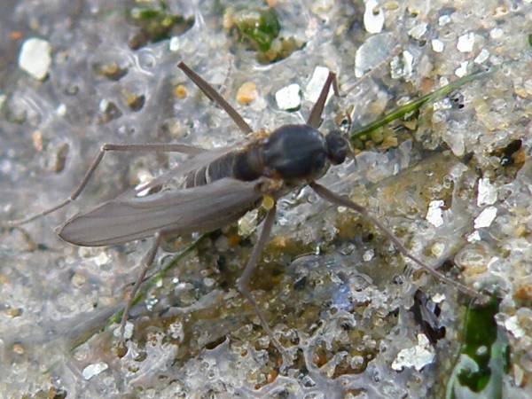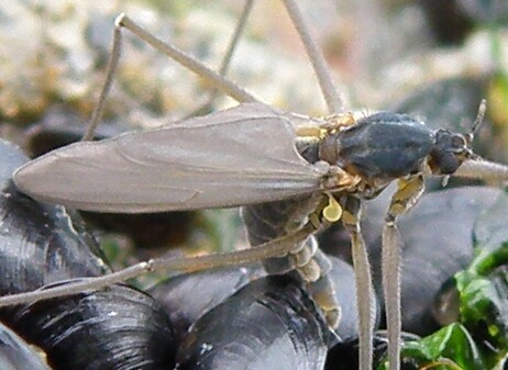 海岸の磯に生息するTelmatogetonイソユスリカ属の1種でしょう.脈相が不明瞭にしか写っていないので,私には種の同定はできません.本属には場所によっては渓流性の種もあります.しかし,渓流に生息し,Telmatogetonに形態や行動がよく似ているのがDiamesaヤマユスリカ属です.早春から羽化しますので,渓流のぬれた岩の表面を走り回って雌を探している雄を観察できます.
