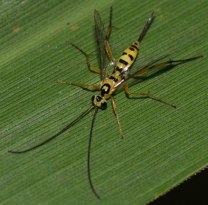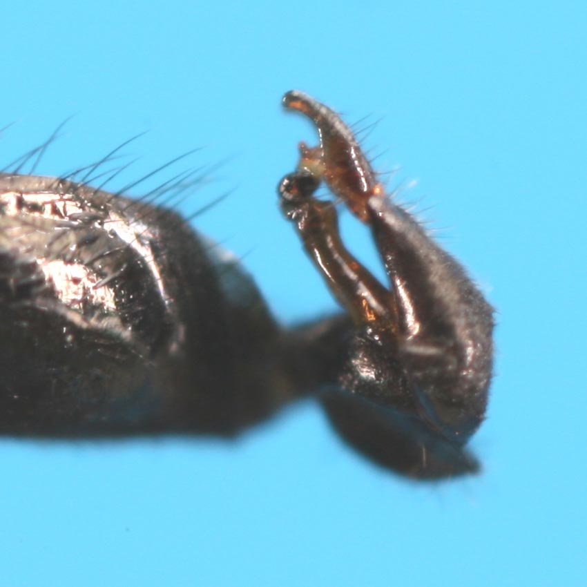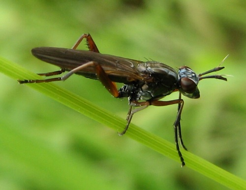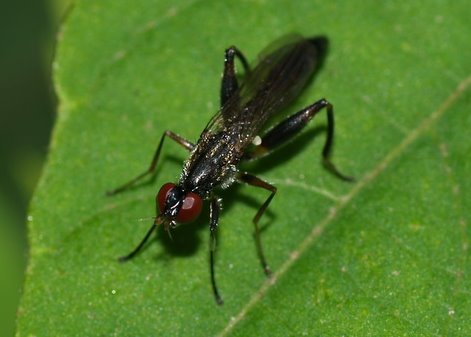 モモブトホソバエ科(フトモモホソバエ科)Megamerinidaeのクロフトモモホソバエ(科名にあわせてクロモモブトホソバエと読み替えることも可能でしょう)Texara compressa Walkerです.後脚の腿節が肥大しているので,科名の異名のフトモモは大腿(太腿)を現す意味もあるからやや難点があり,モモブト(大腿が太い)の方がより端的な和名でしょう.