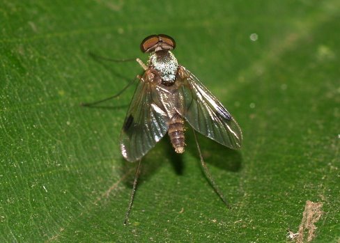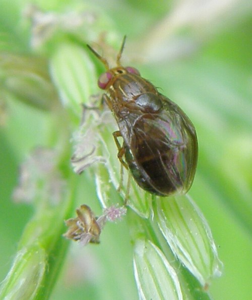 翅が内側に曲がって,まるで甲虫のように見えます.学名のSteganopsisの元になったSteganaはカブトショウジョウバエと言うショウジョウバエ科のハエの属で,これも翅がSteganopsisと同じように曲がって腹部を覆っています.この属は森林の倒木などの近くで生活しています.カブトショウジョウバエにちなんで,Steganopsisはカブトシマバエとでもいうところでしょうか(こんな和名が付いているかは知りません).