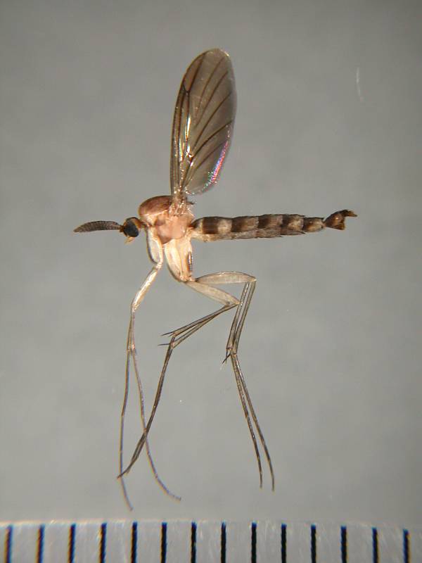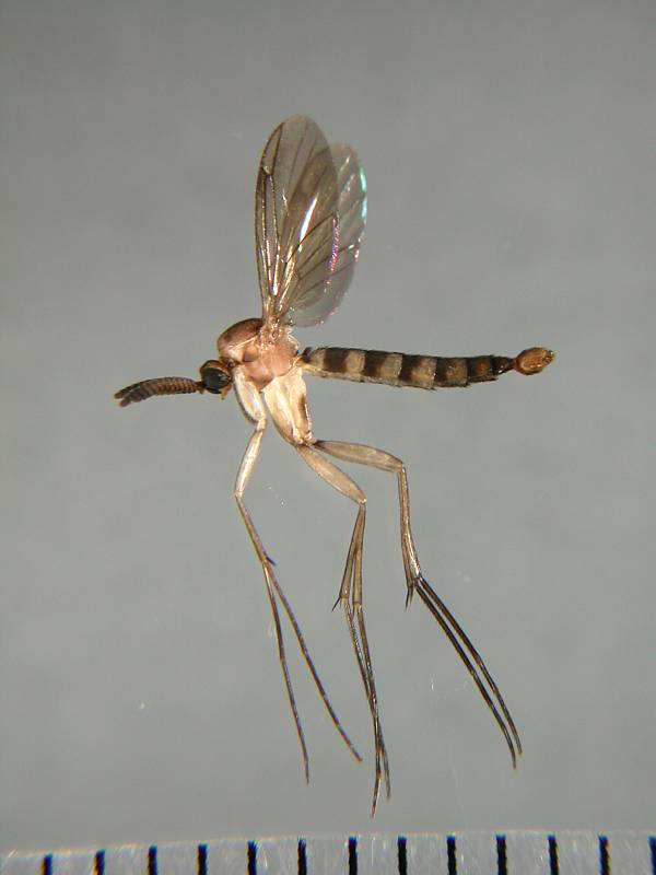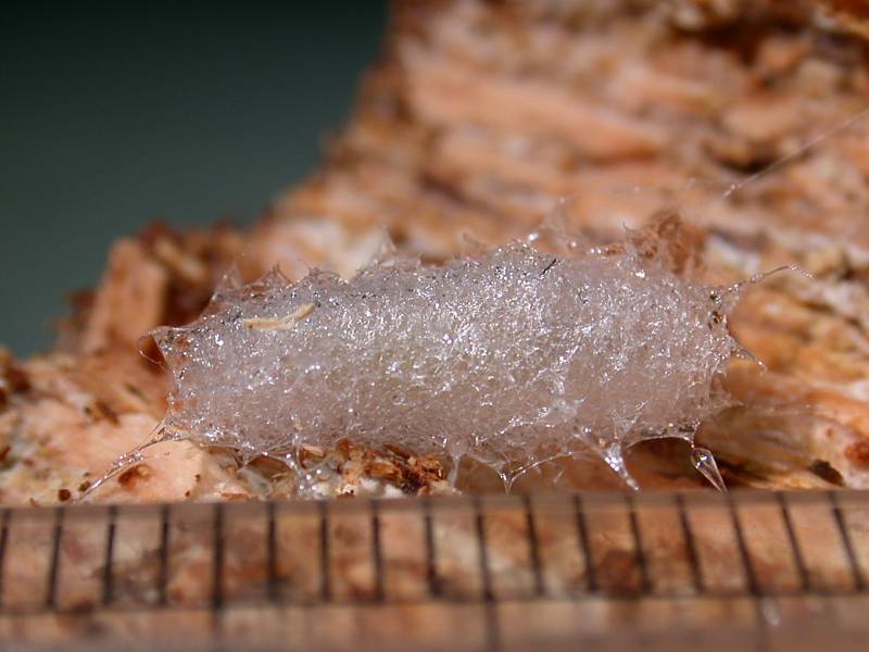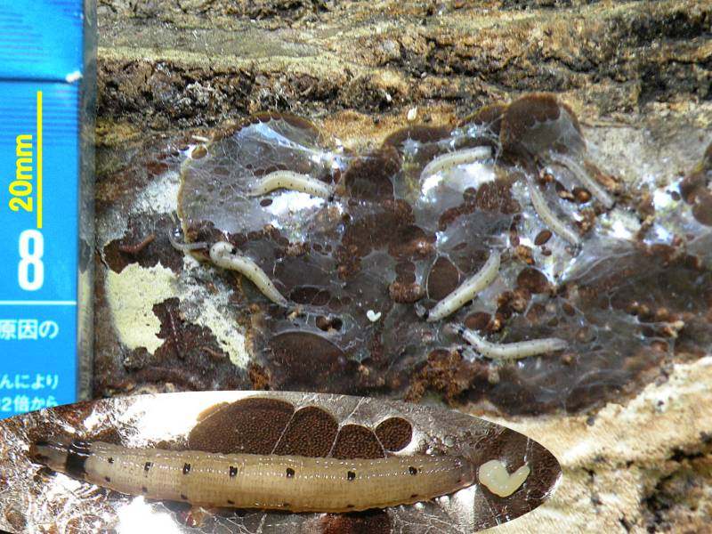 先日貼ったケヅメカと同じ倒木にいた幼虫です。集団で粘液の膜をはり、白い菌膜(?)を食べているようです。 本掲示板の過去スレッド(http://furumusi.aez.jp/joyful1/joyful.cgi?list=pickup&num=4696#4696)でアノニモミイア様の解説を思い出して、「粘液のハンモックにぶらさがる蛹!」を見たいと思い、持ちかえることにしました。(ケヅメカは実はその副産物です。) 2008年7月27日 キノコ付き樹皮採集 兵庫県神戸市須磨区(標高約100m) ♂交尾器長々と失礼しました。 翅脈と触角の特徴からツノキノコバエ科のKeroplatus属だと思うのですが、既知の種なのでしょうか? p.s.この属の幼虫は光る種(いわゆるグロウワーム)がいるそうですが、これは短い観察期間では光りませんでした。